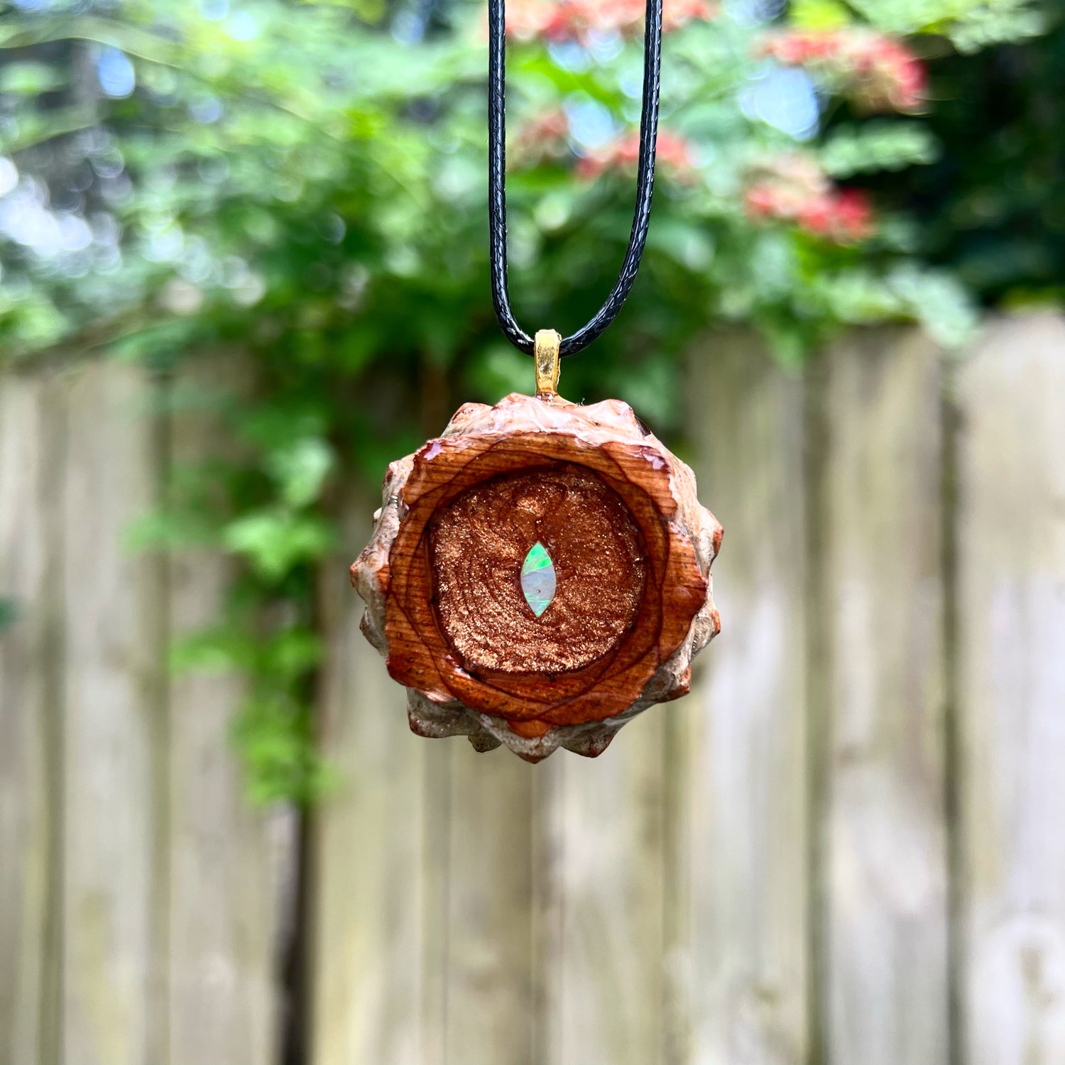 Each of these unique pendants is handcrafted from naturally fallen doorknob pinecones—a rare, rounded variety found in the lush forests of the Pacific Northwest. Carefully selected for their distinct shape and rich texture, the pinecones are cleaned, preserved, and transformed into one-of-a-kind wearable art.
