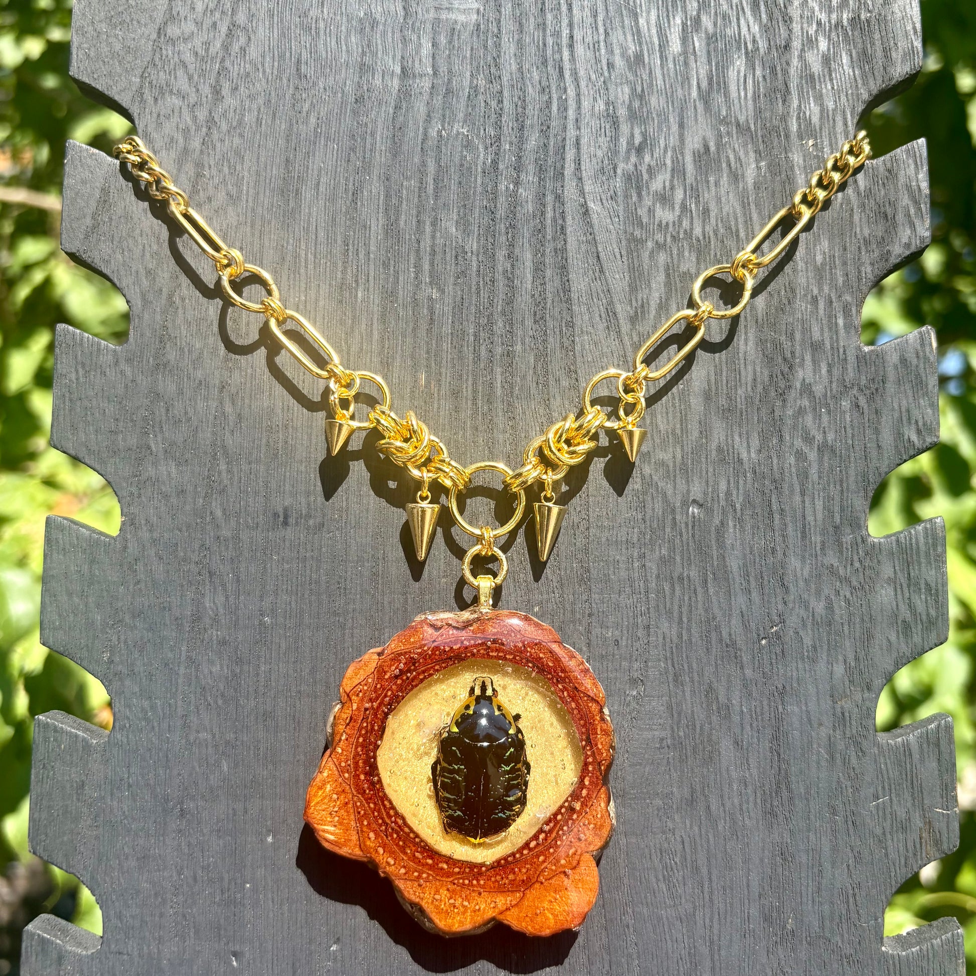 Gold RARE Madagascar Flower Beetle Pinecone Pendant and Chain